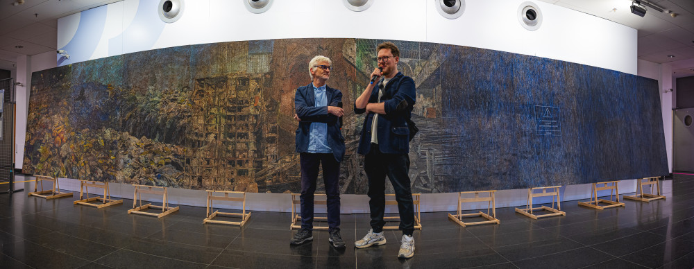 "Od czterdziestu lat maluję "niekończący się" cykl pod wspólną nazwą "The show must go on". Podstawowym elementem całości jest czas. Cykl "Świat który stworzyliśmy" został zapoczątkowany w czasie pandemii. Zapowiedziany lockdown odczytałem jako szansę na nieprzerywaną pracę przez dłuższy okres czasu. Dziesięć obrazów w sto dni. Tematyka cyklu była dla mnie oczywista. Odnalazłem w internecie fotografie powiązane z procesem, który stał za pandemią i zamieniając się w samobieżną drukarkę przeniosłem je na przygotowane płótna. Porównanie z drukarką nie jest tu przypadkowe, ponieważ postanowiłem ten jeden raz pozbyć się zbędnych emocji związanych z procesem malowania. Obrazy zostały podzielone na dziesięć poziomych części. Każdego dnia malowałem jeden poziomy pas, posuwając się jak drukarka od lewej do prawej i z góry na dół. Jeden obraz - dziesięć dni. Dziesięć obrazów - sto dni. Dopiero w następnym etapie pojawiły się emocje. Zacząłem nakładać faktury i warstwy destruujące namalowaną wcześniej opowieść. Choć cały cykl wydaje się być trochę pesymistyczno-katastroficzny, tak naprawdę jest to obraz o sile natury. Mam przeświadczenie, że gdy już się wszyscy powybijamy z jakichś powodów, to nasza planeta bez nas odżyje".