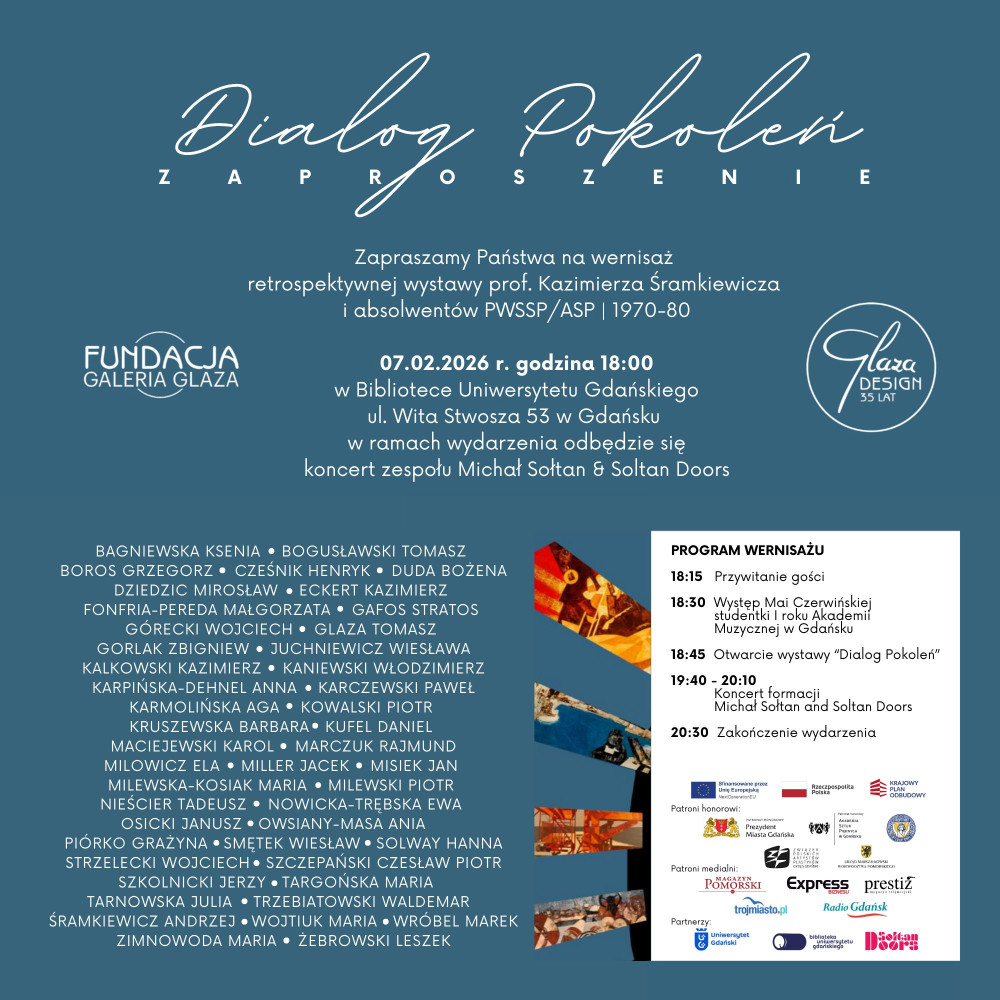 Zapraszamy Państwa serdecznie na wernisaż retrospektywnej wystawy Dialog Pokoleń prof. Kazimierza Śramkiewicza i absolwentów PWSSP/ ASP I 1970-80, który odbędzie się 7 lutego (sobota) 2026 roku w Bibliotece Głównej Uniwersytetu Gdańskiego przy ul. Wita Stwosza 53 w Gdańsku ( I piętro).