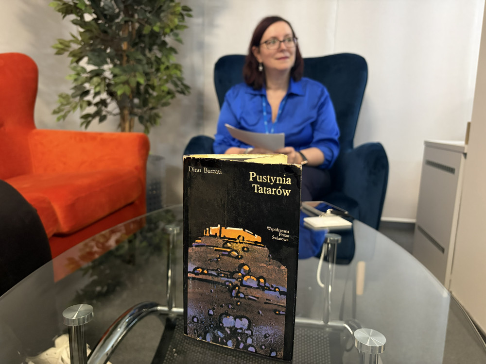 Marcowe spotkanie Klubu Książki "UGryź Książkę" - relacja. Na zdjęciu na pierwszym planie okładka książki "Pustynia Tatarów", w tle osoba prowadząca klub: Monika Budzińska